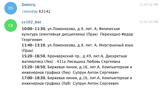 Таким образом, мы получили время, место и название дисциплины (получение номера аудитории остается для самостоятельного выполнения). Наконец добавим нашему боту возможность вывода расписания на понедельник: